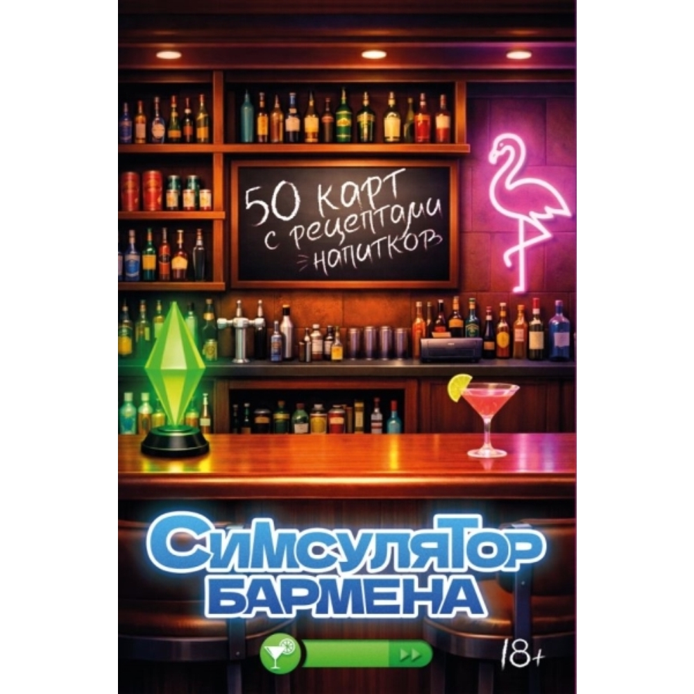 Повышайте навык смешивания и готовьте напитки из The Sims! Вы держите в руках "Симсулятор бармена" - уникальную колоду из 50 карточек-рецептов, вдохновленных легендарной серией игр! Чтобы получить статус звездного бармена, необходимо справиться со всеми рецептами. Готовы ли вы стать мастером шейкера? Каждая карточка оформлена в узнаваемом стиле The Sims и предлагает алкогольные и безалкогольные напитки: • классический "Симсополитен"; • освежающее клубничное ситро; • раскрепощающий "Нектар купидона"; • авторский чай из жужжащей ягоды • и другие коктейли, чаи и напитки. Выберите карточку, подготовьте ингредиенты и смешайте яркие коктейли. Наслаждайтесь любимой игрой и вкусными напитками!
